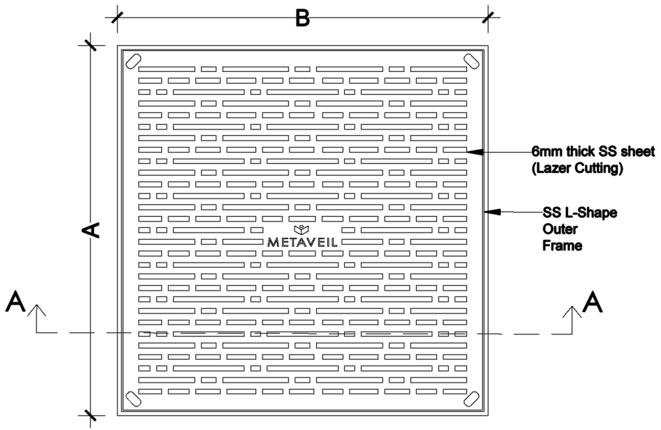 Metaveil Stainless Steel Designer Perforated Drainage Covers are laser cut 6mm thick SS patterns to suit the design language & theme of your architectural pattern with SS frame. These are aesthetic and sturdy floor flushed covers for open drains.